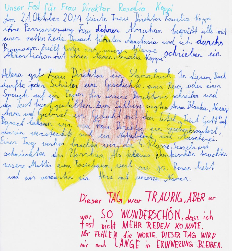 Die Volksschulkinder und Lehrerinnen bedankten sich mit lustigen Mundartgedichten und schönen Liedern. Josef Pitzl komponierte sogar ein Lied für Frau Lehrer Koppi, welches von den Schülerinnen und Schülern gemeinsam mit der Bläserklasse zum Besten gegeben wurde. ![]()