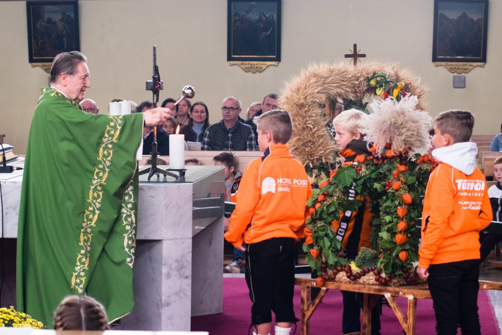 … bevor er die Erntedankkronen segnet.