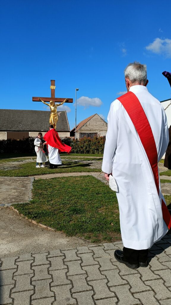 Die anschließende Prozession führte zum Monsignore Lentsch Platz, wo die Palmzweige am Kreuzplatz gesegnet wurden. Die aufgelegten, gesegneten Palmzweige können mit nach Hause genommen oder gerne auch Bekannten gebracht werden.