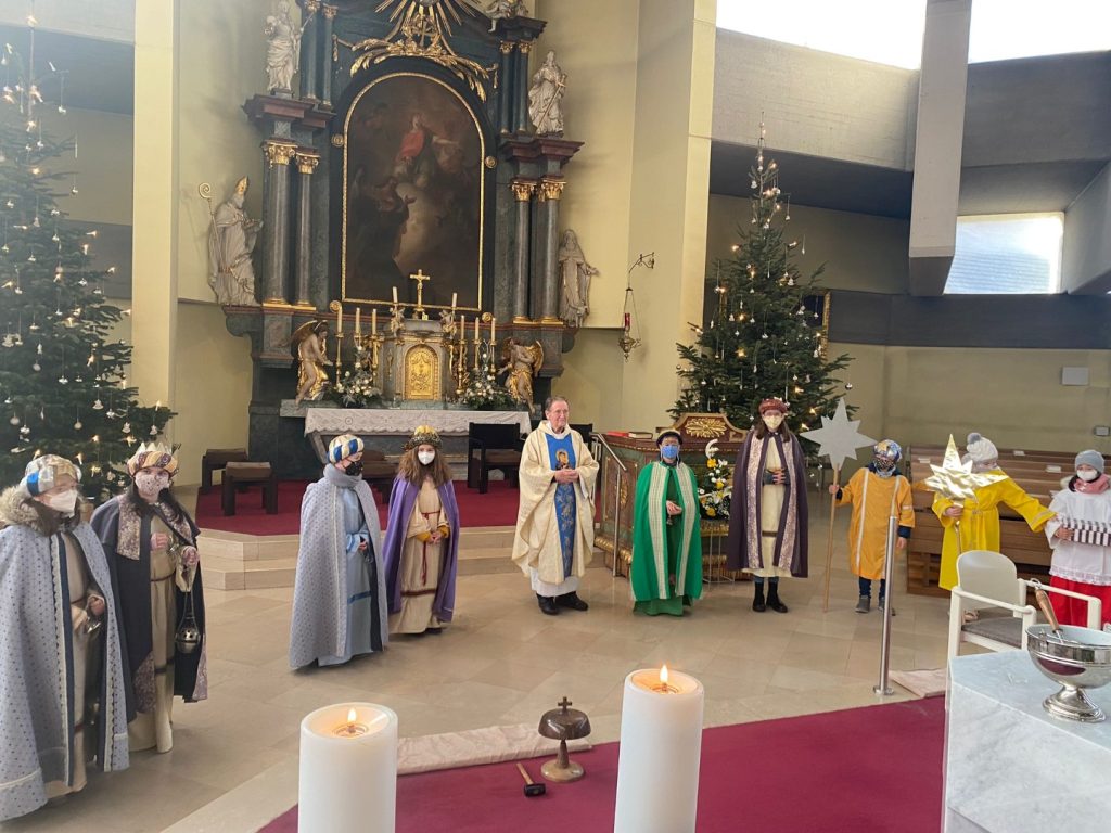 Unsere Ministranten, gekleidet als Kaspar, Melchior und Balthasar, wurden von Msgr. Lentsch in einer Andacht zu den Plätzen gesendet. Ein Sternträger und „Kassier“ durften natürlich auch nicht fehlen.