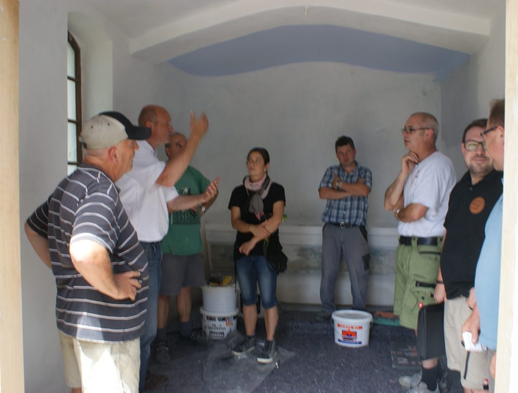 Claudia: Bei einem meiner Besuche legten die beiden Restauratoren gerade die Schichten an der Decke frei und sag ich so scherzhalber zu den beiden Herren: „Ich muss jetzt zur nächsten Baustelle, aber wenn ihr den Himmel findet, dann ruft mich an!“